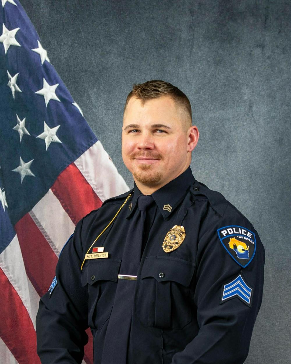 Portrait of Bradley Dimmick sitting in front of an American flag