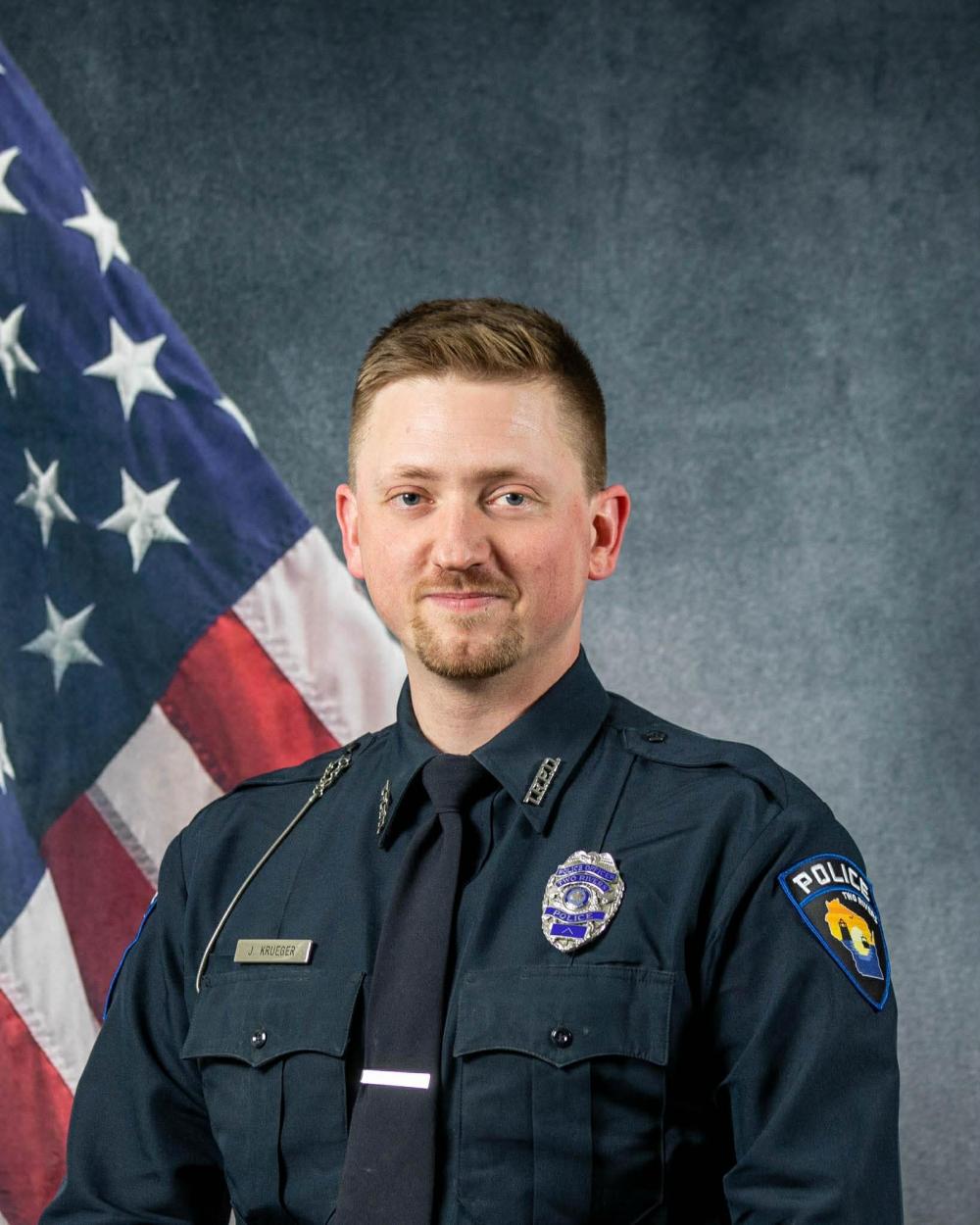 Portrait of Justin Krueger sitting in front of an American flag