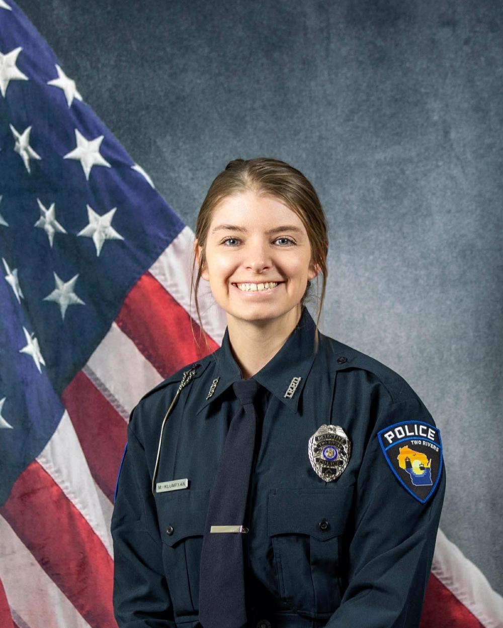 Portrait of Megan Klumpyan sitting in front of an American flag